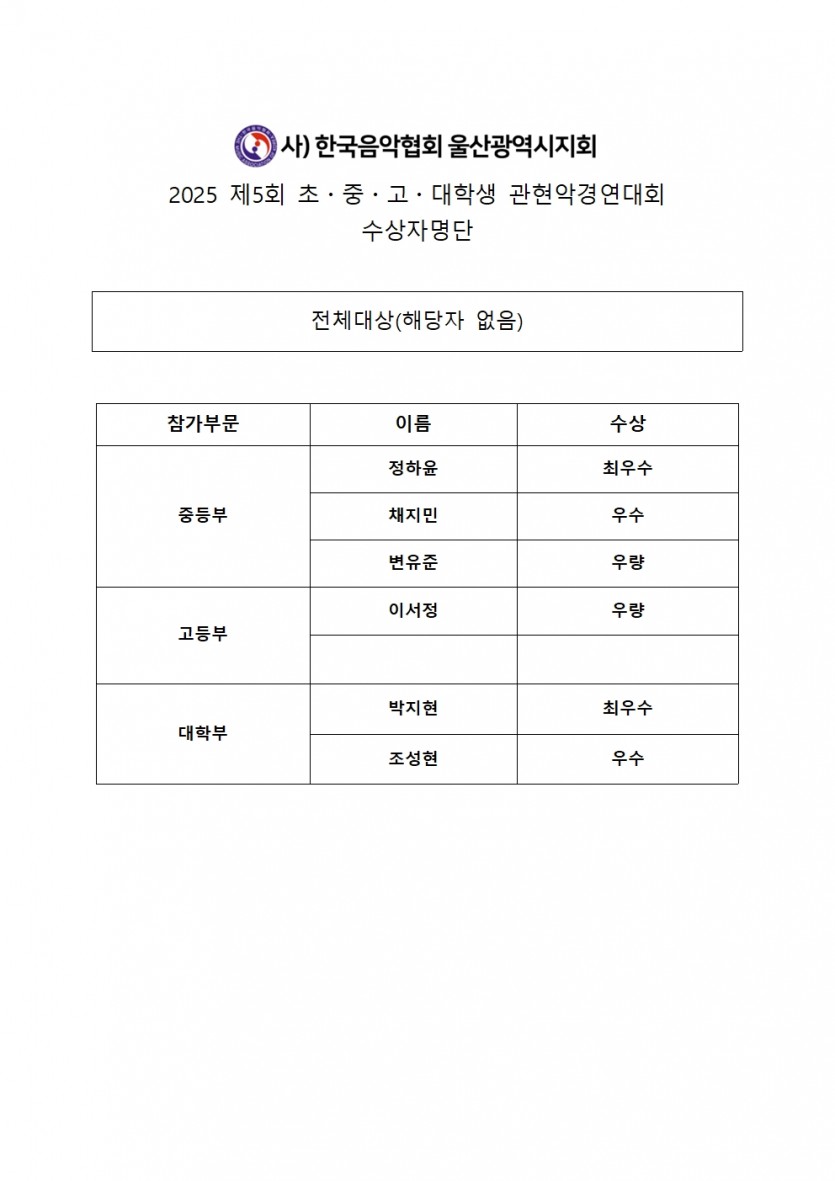 2025 제 5회 울산음악협회 관현악경연대회 수상자명단