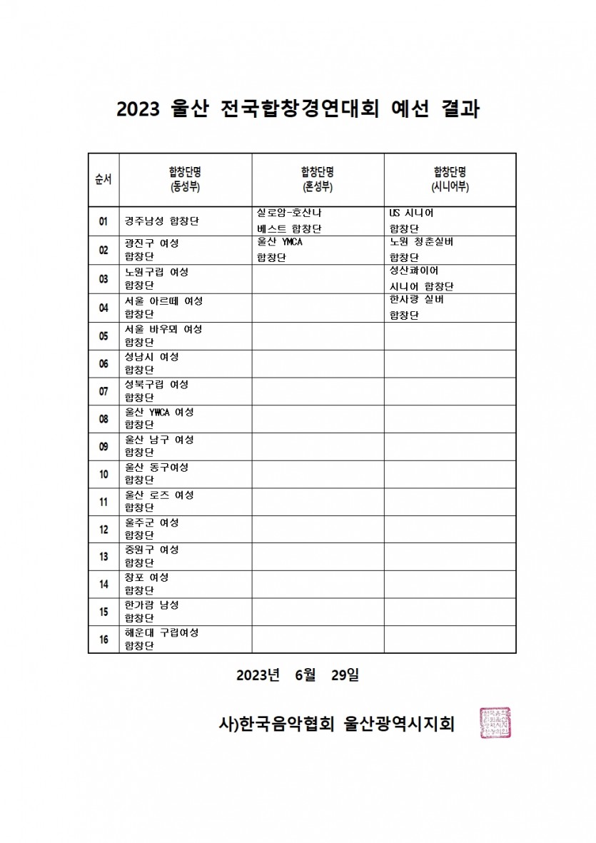 2023 울산 전국합창경연대회 예선 결과 입니다.