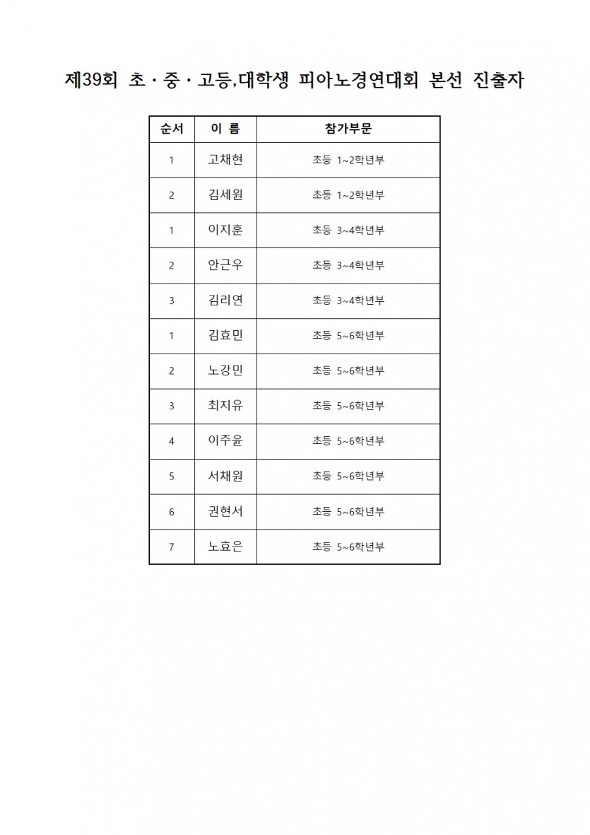 2023 피아노 경연대회 초등부 예선 결과