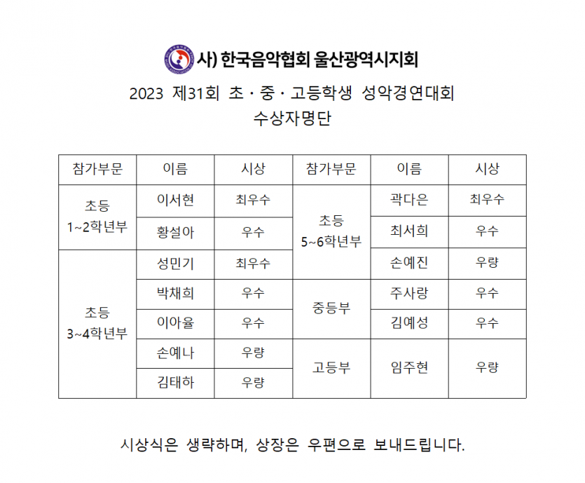 [대회결과] 2023 제31회 초,중,고등학생 성악경연대회 수상자명단
