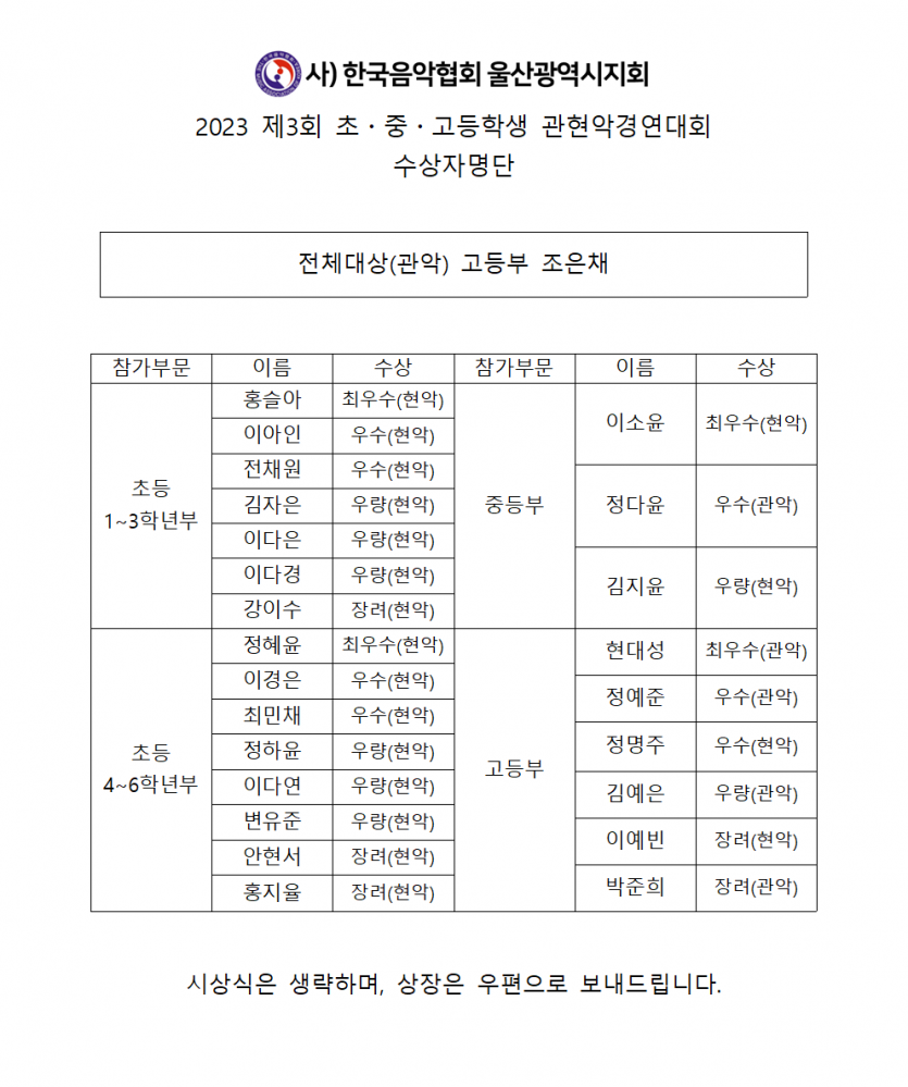[대회결과] 2023 제3회 초,중,고등학생 관현악경연대회 수상자명단