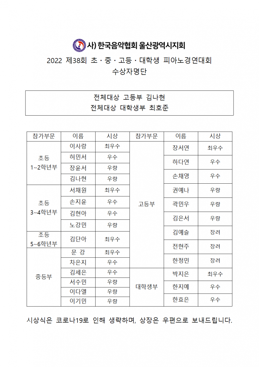 2022 제38회 초,중,고등,대학생 피아노경연대회 수상자명단